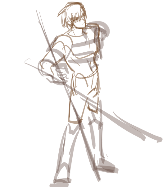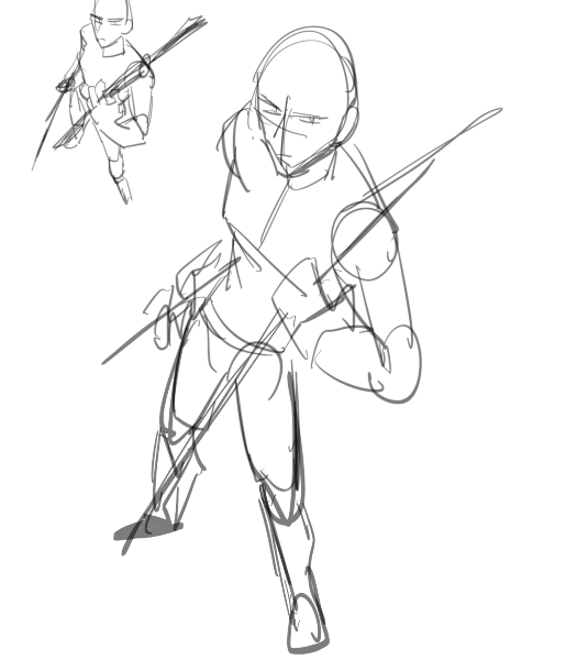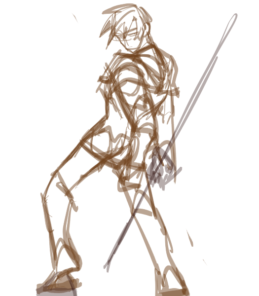 デッサン人形を見ながら描いたやつだけど、この角度の俯瞰、かなり足が縮めないと自然に見えない。