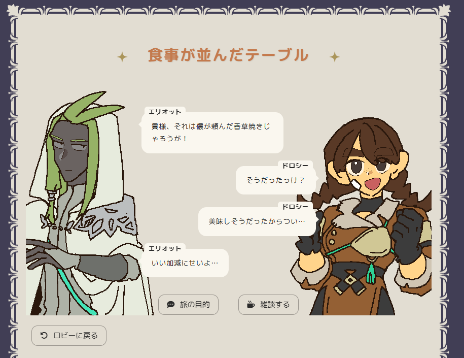 これ吹き出しとか全部アニメーションで出てきます。アニメーション速度は設定スライダーから変更できます。文字の大きさとかもいじれます。正直この会話部分の見栄えが最高によくて、作者自身が無限に雑談を押す罠に陥っているという。