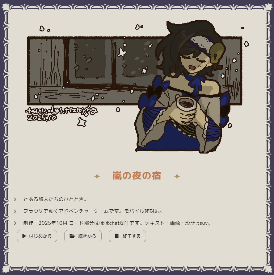 きっかけ:ふと「そういやwebゲームブック作りたいって言ったけどまだやってないな~、GPTさんに相談するか~」とはじめたら、思ったよりもとんとん拍子で進んでしまい、後に引けなくなってしまいました。