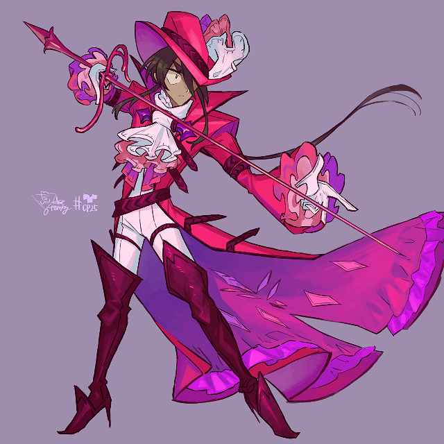 武器はエストックです。柄のほうが短い槍ですね。フラミンゴみたいな単色ピンクへと果敢に挑み、負けて白を入れてしまいました。かわいいを避けるために色味もショッキングピンクを多めに選び、トゲトゲのシルエットを入れて男っぽさと虫っぽさを出そうとしています。テーマについてはあまり考えていなかったのですけど、描いてから浮かんだのはヴァンパイアハンターでした。(ここに、友達が吸血鬼であるので非常に複雑な顔をするリベレのアイコン)