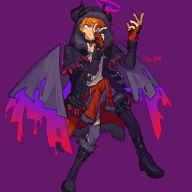 だって下書きのポーズがこんなんだったらどんなにダークでかっこいい衣装でもただのはしゃいでるバカにしかならないじゃん。どう頑張っても陽を隠せないじゃん。なので、もういっそ諦め、ハロウィンで浮かれる男のかわいさを前面に押し出しました。クールさよ、さらば……。フードや腰巻ジャケットでアイドルっぽさを入れ、厨二だいすきアイコンとしてベルト/ボロボロ布/チョーカーなんかを使いました。最後に角をそっとフードにつけましたが、あざとすぎると思います。