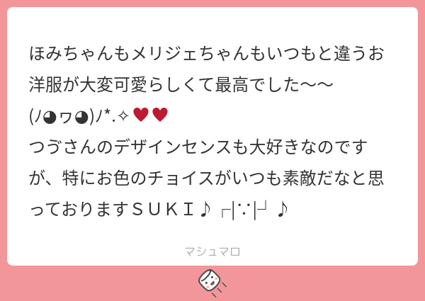 ありがとうございます〜。かわいい担当にはとことんかわいいを着せることができ、よい……。