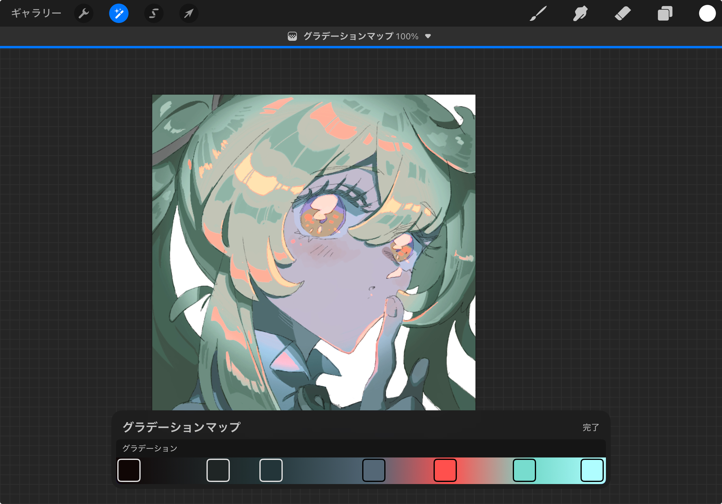 そのまま適用するとこんな感じなので、欲しい色味に近づけるためにグラデーションマップをかける。めっちゃ赤くしたら記事トップみたいになった。かわいい。