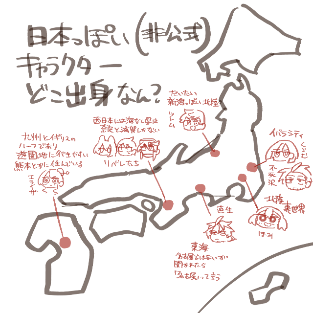 の地方というか出身県について、元々イメージはあったんですが改めて図にしてみる会。フィクションジャパンであるということを念頭に置いて楽しんでください。