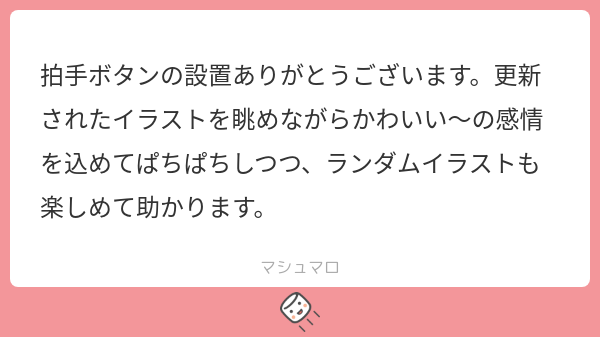 アクセス解析とかを特にしていないサイトなので、誰かが見てくれてるのかを知るのは反応頼りになってしまうのですが、結構気軽にぽちぽちされてるとわかり嬉しさが高まっています。お礼絵も楽しんでいただけてるみたいで嬉しいです。